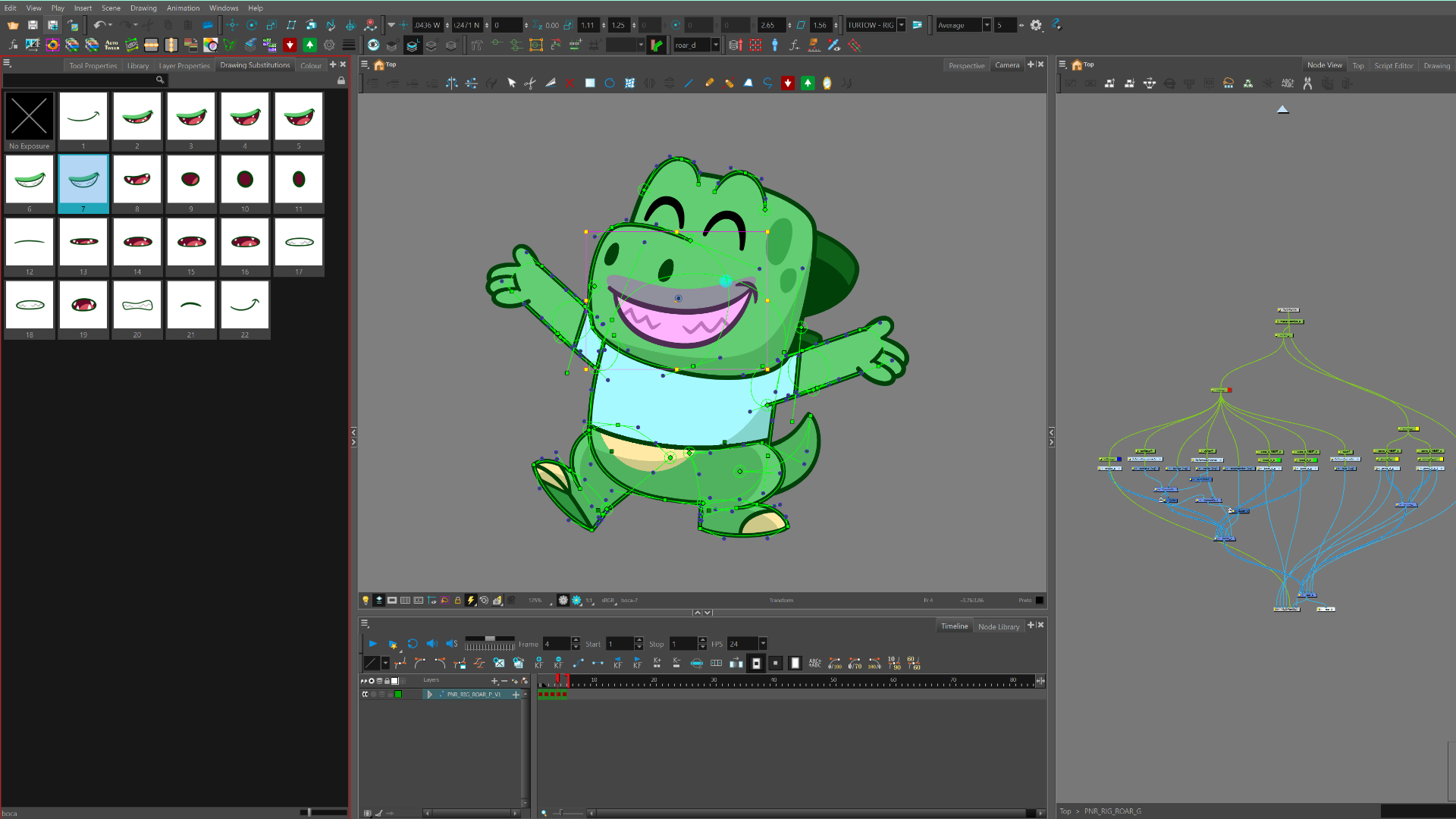 Inside Toon Boom Harmony file showing Node View connections, deformer, pegs and library drawings.